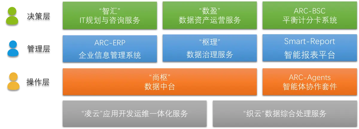 決策層,“智匯”IT規(guī)劃與咨詢服務(wù),憑借專業(yè)團(tuán)隊(duì)對(duì)行業(yè)趨勢(shì)和技術(shù)生態(tài)的深度洞察,為企業(yè)量身定制契合發(fā)展戰(zhàn)略的IT架構(gòu)藍(lán)圖,明晰數(shù)字化路徑;“數(shù)盈”數(shù)據(jù)資產(chǎn)運(yùn)營服務(wù),挖掘企業(yè)數(shù)據(jù)價(jià)值,將分散數(shù)據(jù)轉(zhuǎn)化為可運(yùn)營、能創(chuàng)造效益的資產(chǎn),驅(qū)動(dòng)業(yè)務(wù)創(chuàng)新;ARC - BSC平衡計(jì)分卡系統(tǒng),以戰(zhàn)略為導(dǎo)向,從財(cái)務(wù)、客戶、內(nèi)部流程、學(xué)習(xí)與成長等維度,量化指標(biāo)、監(jiān)控進(jìn)度,助力科學(xué)決策 。
