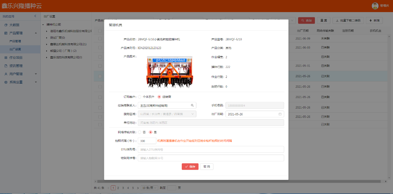 - 作業項目:為播種機(農機)生產廠家和播種機(農機)經銷商提供作業項目跟蹤服務的功能。