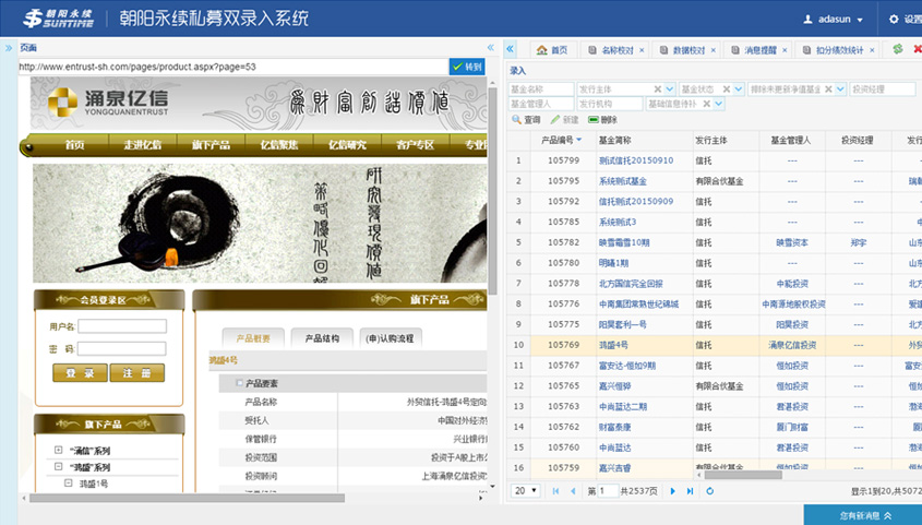 - 錄入系統:使用錄入系統錄入基金產品和凈值信息,提交校對人員校對。高權限人員可分配隊列中的任務給指定的錄入人員等
